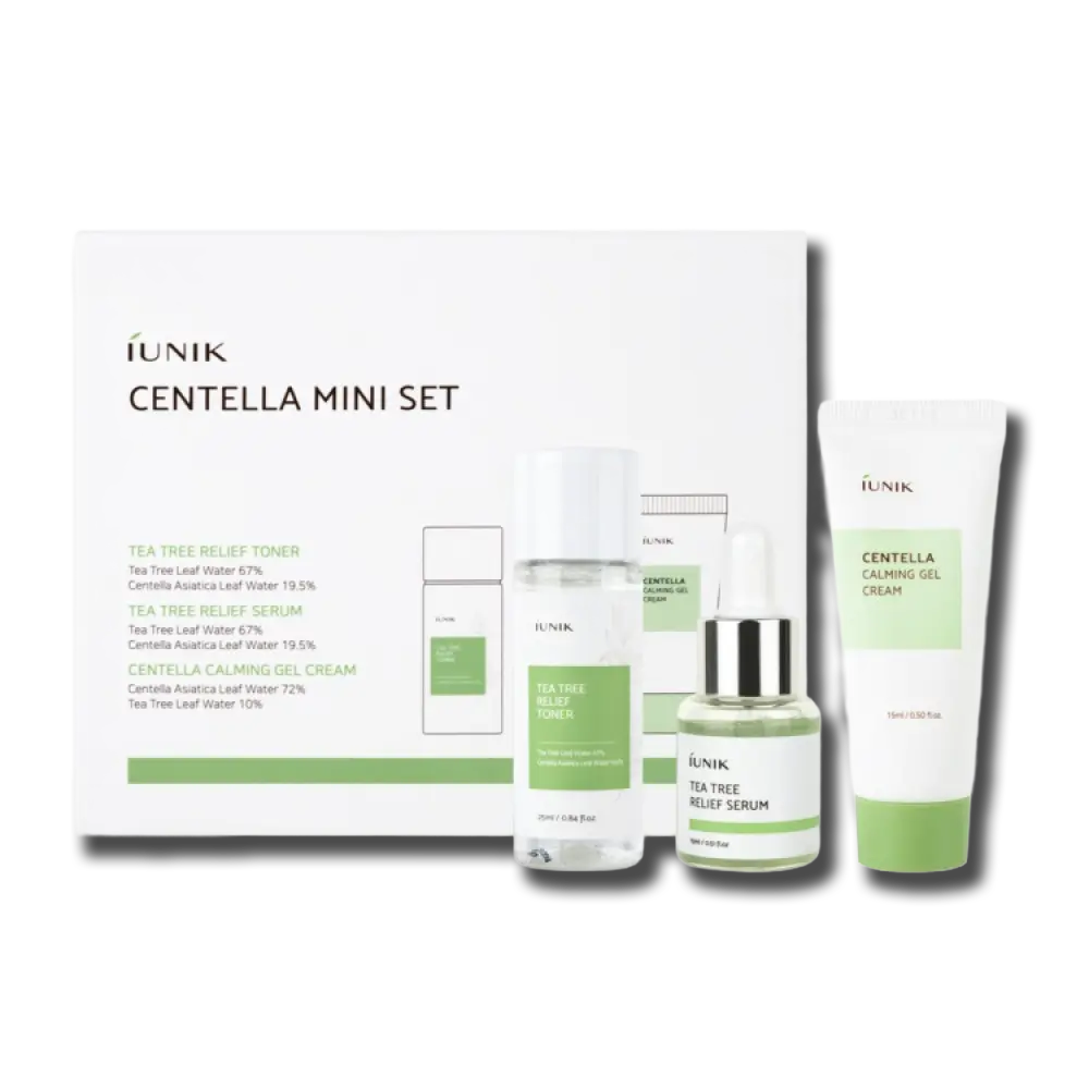 IUNIK Centella Mini Set – дорожній набір догляду з трьох засобів: тонера, сироватки та гелевого крему, збагачених 67 % чаєвого дерева і 19,5 % центелли. Ідеальний для швидкого заспокоєння, балансування та зволоження чутливої або проблемної шкіри.