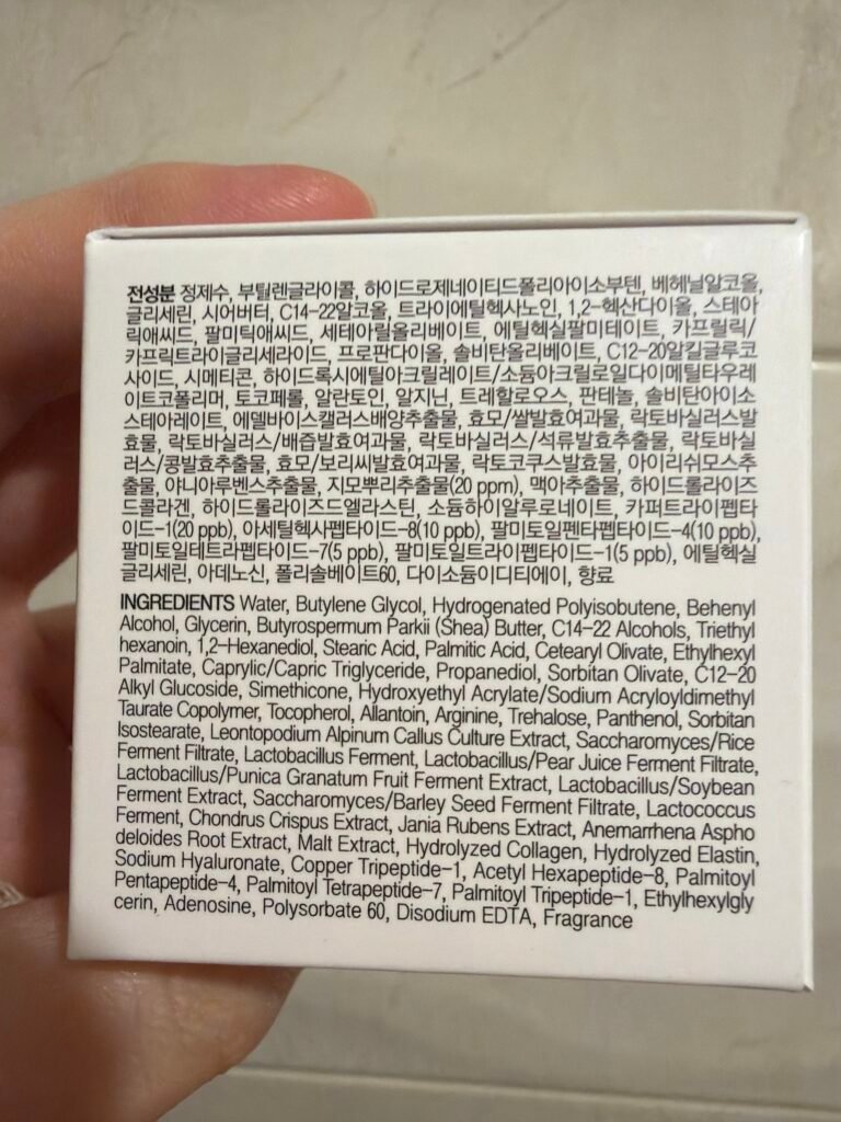 Вода, бутиленгліколь, гідрогенізований поліізобутен, бегеніловий спирт, гліцерин, олія ши, с14-22 спирт, триетилгексаноат, 1,2-гександіол, стеаринова кислота, пальмітинова кислота, цетеариловий оліват, етилгексил пальмітат, каприловий/каприновий тригліцерид, пропандіол, сорбітан оліват, C12-20 алкіл глюкозиди, симетикон, гідроксіетил акрілат/сополімер акрілоілдіметіл таурату натрію, токофероли, алантоїн, альгінін, трегалоза, пантенол, сорбітан ізостеарат, екстракт калюсної культури едельвейса, фільтрат дріжджів/рисового ферменту, Lactobacillus ferment, Lactobacillus/pear juice ferment filtrate, Lactobacillus/pomegranate ferment extract, Lactobacillus/екстракт ферменту сої, фільтрат фільменту дріжджів/насіння ячменю, фермент лактокока, екстракт ірландського моху, екстракт Yania Rubens, екстракт кореня Zymocephalus (20 ppm), екстракт солоду, гідролізований колаген, Гідролізований еластин, Гіалуронат натрію, Трипептид міді-1 (20 ppb), Ацетил Гексапептид-8 (10 ppb), Пальмітоіл Пентапептид-4 (10 ppb), Пальмітоіл Тетрапептид-7 (5 ppb), Пальмітоіл Трипептид-1 (5 ppb), Етилгексілгліцерин, Аденозин, Полісорбат 60, Дисодіум ЕДТА, Аромат.