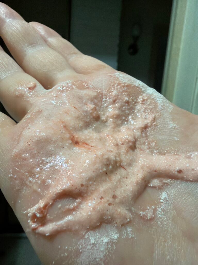 Maltodextrin, Sodium Cocoyl Isethionate, Corn Starch, Sodium Lauroyl Glutamate, Potassium Myristate, Calcium Stearate, Sodium Bicarbonate, Sodium Polyacrylate, Citric Acid, Glucose, Coconut Acid, PVP, Rice Bran, Purified Water, Sodium Isethionate, Decyl Glucoside, Microcrystalline Cellulose (100 ppm), Butylene Glycol, 1,2-Hexanediol, Salicylic Acid, Panthenol, Gluconolactone, Hydrogenated Rice Bran Oil, Dextrin, Propanediol, Bromelain, Papain, Oat Peptide, Ethylhexylglycerin, Pea Peptide, Sodium Hyaluronate, Glutathione, Calcium Propionate, Potassium Sorbate, Apple Cell Culture Extract, Hydrolyzed Sodium Hyaluronate, Hydroxypropyltrimonium Hyaluronate, Potassium Hyaluronate, Hyaluronic Acid, Hydrolyzed Hyaluronic Acid, Sodium Hyaluronate Crosspolymer, Thiamine Hydrochloride, Riboflavin, Niacin, Carnitine Hydrochloride, Pantothenic Acid, Folic Acid, Copper Tripeptide-1, Tocopherol, Acetyl Hexapeptide-8, Ascorbic Acid, Retinyl Palmitate, Biotin, Oligopeptide-29, Oligopeptide-32, Nelumbo Nucifera Leaf Extract, Pentylene Glycol, Sodium Acetylated Hyaluronate, Palmitoyl Pentapeptide-4, Sodium DNA (0.00005 ppm), Iron Oxide Red (CI 77491).