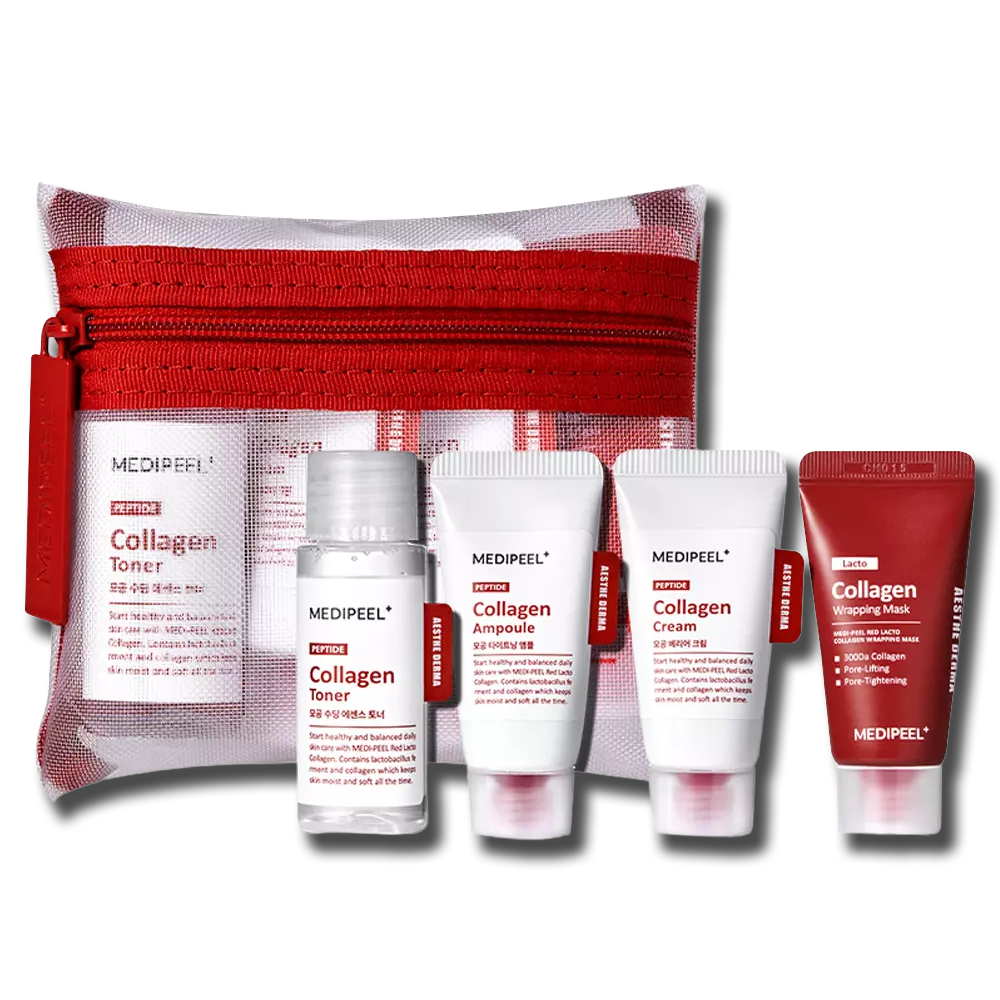 MEDIPEEL Red Lacto Collagen Skin Care Trial Kit — міні-набір засобів для догляду за шкірою з колагеном, пробіотиками та фірмовими компонентами MEDIPEEL, створений для м’якого зміцнення шкіри, відновлення балансу мікробіому та додання сяйва. Ідеальний для подорожей.