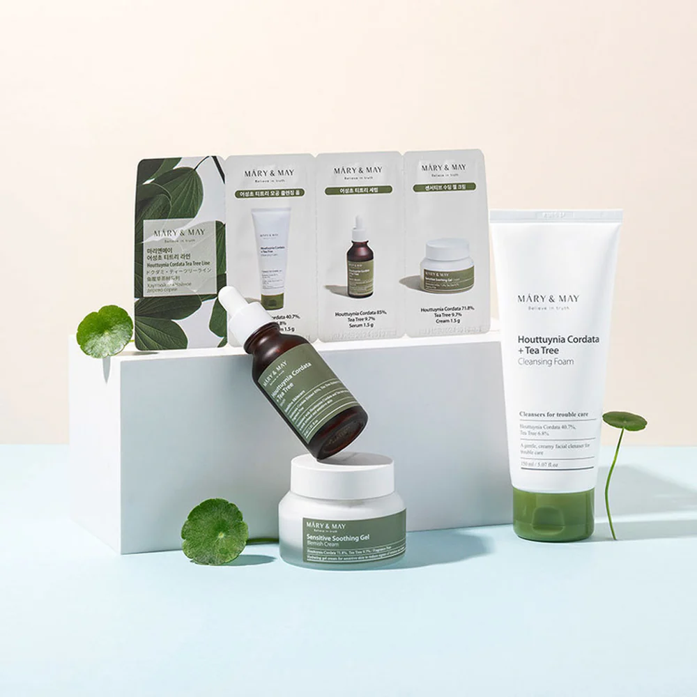 Mary&May Houttuynia Cordata Tea Tree Line Sachet Set – набір із трьох мініатюр для догляду за проблемною, жирною та чутливою шкірою. До складу входить екстракт хоутоунії, чайне дерево та заспокійливі комплекси, які глибоко очищають, знімають запалення і регулюють себум.