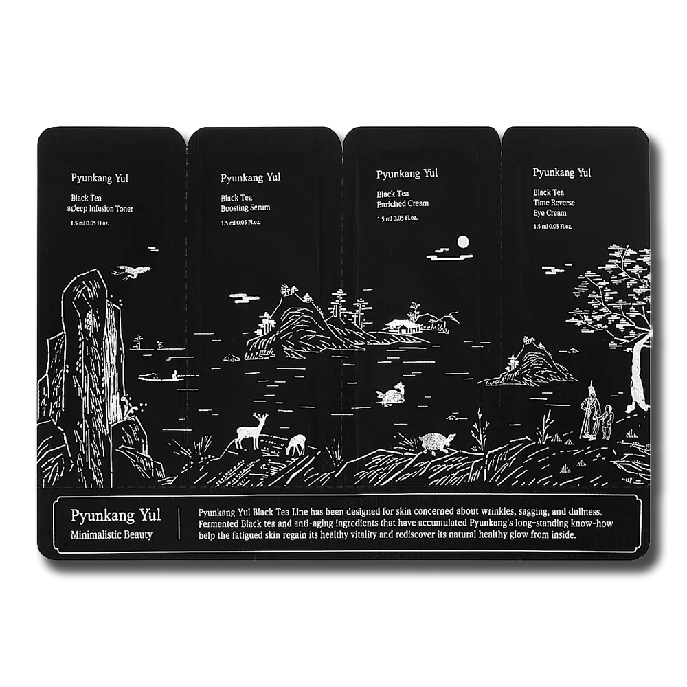 Pyunkang Yul Black Tea Sample Pouch Set — набір пробників преміальної антивікової лінійки з ферментованим чорним чаєм (комбучею), що забезпечує глибоке живлення, зволоження та підвищення еластичності шкіри. Ідеально підходить для знайомства з продуктом або для догляду в дорозі.