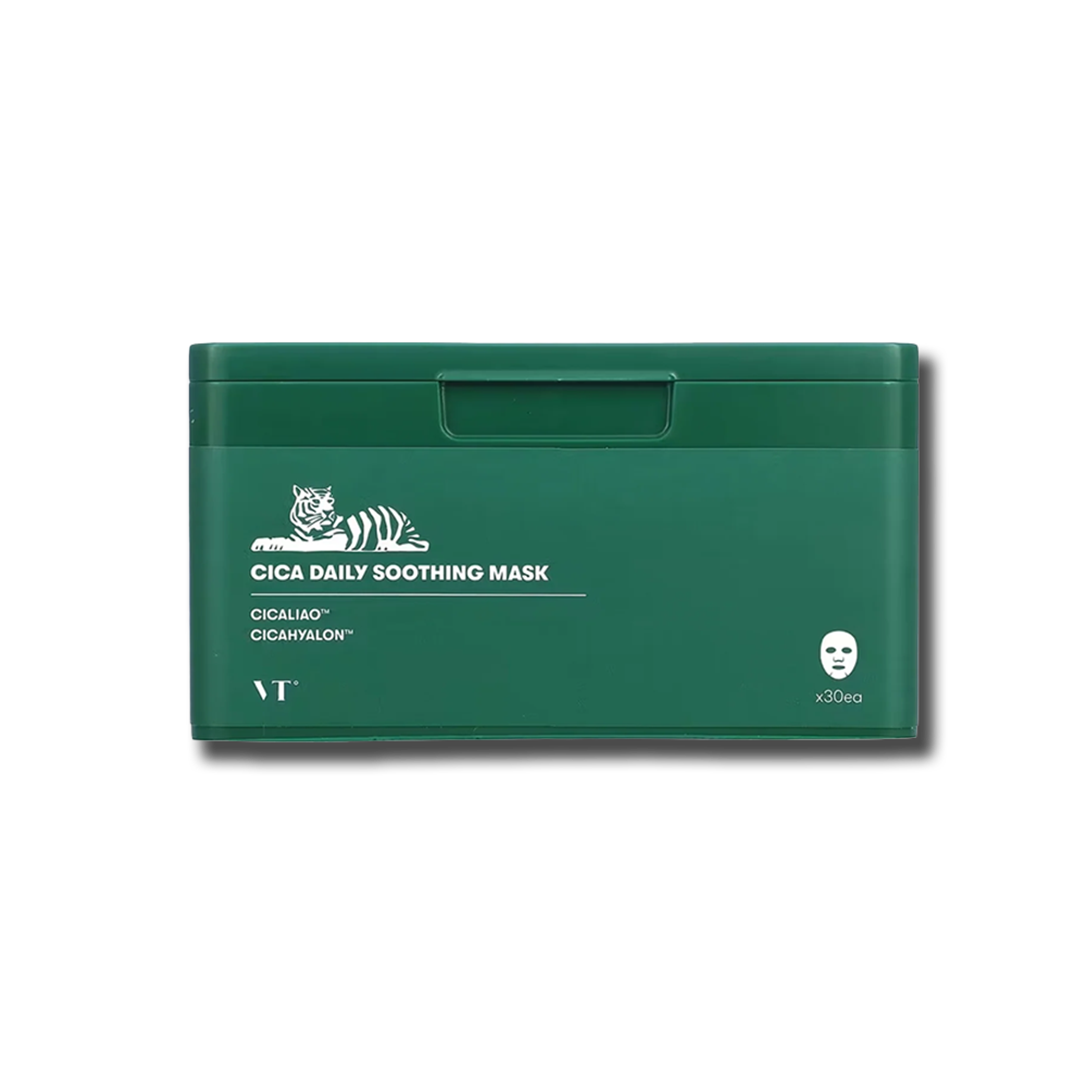 VT Cosmetics Cica Daily Soothing Mask — щоденні заспокійливі тканинні маски з комплексом Cica для чутливої шкіри. Маски мають миттєвий заспокійливий ефект, знімаючи запалення та подразнення, а також насичують шкіру зволожувальними та поживними компонентами, регулюють водно-ліпідний баланс і мають відновлювальні властивості. Роблять шкіру свіжою, гладенькою та відпочилою, надаючи їй природне сяйво.
