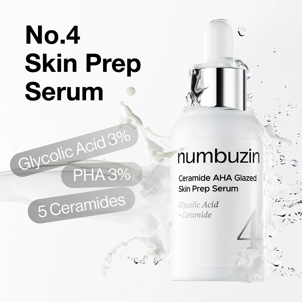 Numbuzin No.4 Ceramide AHA Glazed Skin Prep Serum – зволожувальна сироватка-пілінг з AHA та PHA кислотами й комплексом керамідів. Вирівнює текстуру шкіри, забезпечує м’яке оновлення без подразнення та глибоке зволоження.