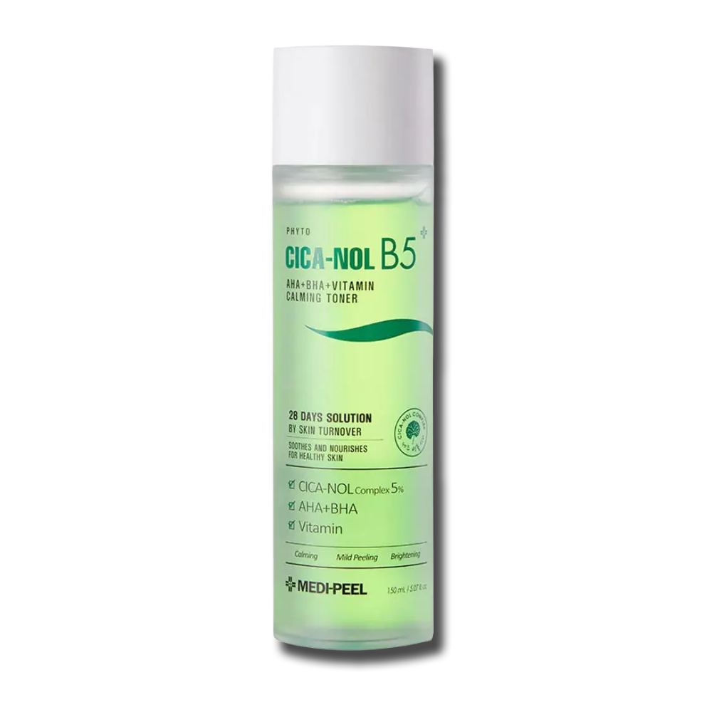 Medipeel Phyto Cica‑Nol B5 AHA BHA Vitamin Calming Toner — тонер із поєднанням AHA/BHA кислот, центели азіатської, вітаміну B5 та комплексу вітамінів. Ніжно видаляє залишки забруднень, заспокоює, вирівнює тон і покращує текстуру шкіри, залишаючи її підготовленою для подальшого догляду.